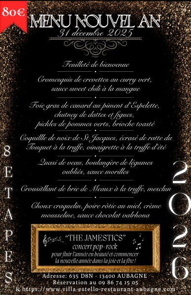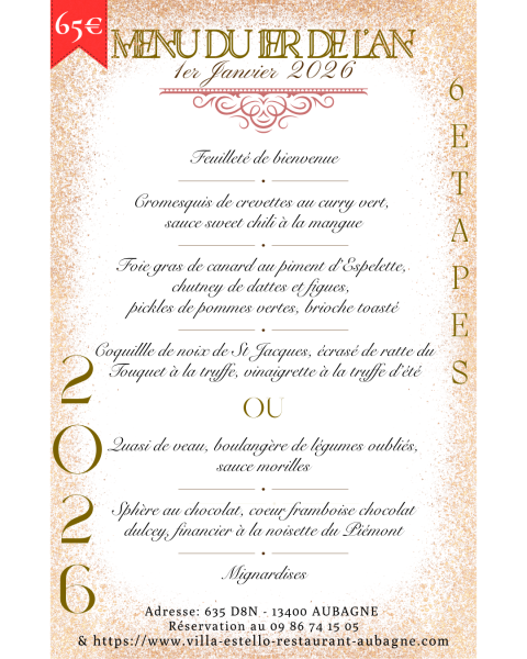 La villa Estello vous propose dès à présent son menu du 1er de l'an disponible le 1er Janvier 2026 !